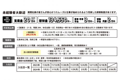 | 勤務時間 | 主に昼夜交替勤務 広島本社工場 <昼勤>8:15 ~ 17:00 <夜勤>20:15 ~翌5:39 防府工場 <昼勤>8:25 ~ 17:10 <夜勤>20:15 ~翌5:39 |